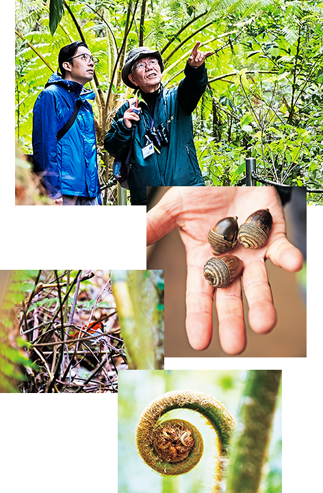 上/ガイドの“カールさん”(右) が鳥の居場所を教えてくれた。 中央右/日本でいちばん大きなどんぐり、オキナワウラジロガシ。 中央左/天然記念物のホントウアカヒゲ。 下/シダ植物のヒカゲヘゴの芽。ヒカゲヘゴは、大きいものは15メートルほどにもなるそう。
