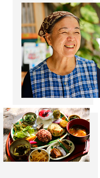 国道58号線沿い、国頭村の南の大宜味村にある『笑味の店』の店主・金城さんは、昔からおじぃ、おばぁが食べてきた食材を使って元気がでる食事を供しています。この日は、“おまかせランチ”という意味の「まかちくみそーれランチ」 (980円)をいただきました。モーイードーフ(海藻の一種「いばらのり」を使った豆腐)や、タピオカアンダギーなど、ここでしか食べられないもののオン パレード。「サータアンダギー、緑色っぽかったですけど、何が入ってるんですか?」「カラギ(琉球シナモン)よ。いつもお茶にしているんだけど、サータアンダギーに入れてもおいしいね」。どうりで滋味深いわけです。