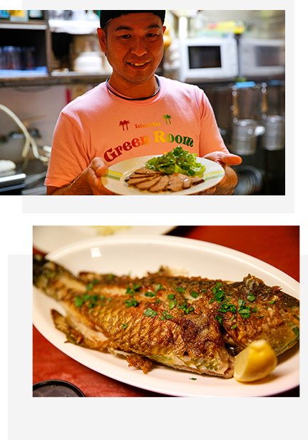 「ブダイの丸ごとロースト」(800円)。青々としたイラブチャー(ブダイ)がこんなにおいしいとは!