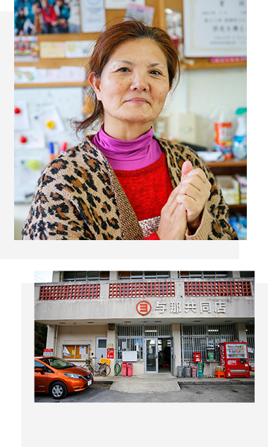 国道58号線からやんばる西側の安田(あだ)地区へと抜ける与那安田横断道路の入り口が与那地区。そこにある『与那共同店』で店頭に立っていた神山さんは、店を任されて4年目になります。共同店とは、集落の地域住民の共同出資・共同運営により運営されている沖縄ならではの売店のこと。与那共同店は地域の人たちの憩いの場で、毎日のように集落の人が集まってきます。そうなると神山さんはただの「店員さん」ではなく、ポークたまごを作る料理人になったりして大忙しとか。「おじぃ、おばぁのクリスマス会コンサートとかもやってるのよ」。