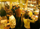 ビッグなワインオープナーが張り付いたドアを開けると…賑わってます!店内には至るところにお酒やおつまみのメニューがヒラヒラ…ん?「酒屋のすべてのワイン、こちらで飲めます。オ・ト・ク!」? |