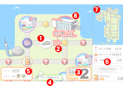 | 【ガソリン】 | 残りのガソリン数です。1コマ進むたびに ガソリンを2消費します。 日産のお店イベント開催中に日産のお店によって メンテナンスをしてもらうと、ガソリンの消費が半分になります。 |