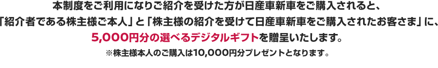 - ・本制度を利用して新規に日産車(新車)を日産自動車の正規販売店にてご購入いただいた場合、ご紹介者、ご購入者様ともに5,000円分の選べるデジタルギフトを贈呈いたします。