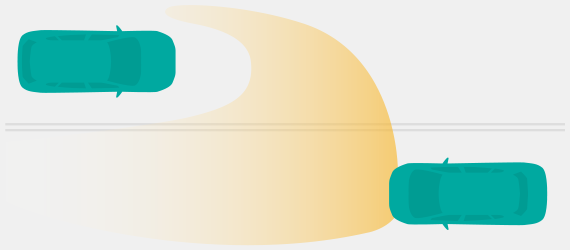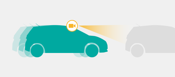 前方車両や歩行者※を検知し、衝突するおそれがあると判断すると音と表示でドライバーに回避操作を促します。さらに衝突の危険性が⾼まったときには、強いブレーキを作動させて衝突を回避、または衝突時の被害や傷害を軽減します。
