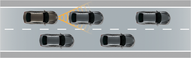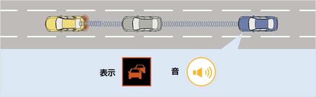 前方車両や歩行者※を検知し、衝突するおそれがあると判断すると音と表示でドライバーに回避操作を促します。さらに衝突の危険性が⾼まったときには、強いブレーキを作動させて衝突を回避、または衝突時の被害や傷害を軽減します。