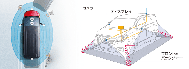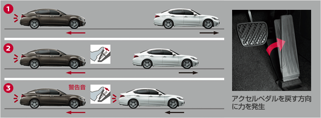 進行方向に壁などがある場所での駐車操作中(約15km/h未満)、ブレーキ操作が遅れたり、アクセルペダルをブレーキペダルと間違えて踏み込んでしまった場合、警告すると共にエンジン出力やブレーキを制御し、過度の加速や衝突防止を支援します。さらに前方カメラと連携したシステムでは、車両や歩行者の検知と、それらに対する作動車速を低速走行時(約25km/h以下)まで拡大しました。