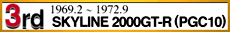 「羊の皮を着た狼」S54Bの血統を引き継ぐスカイライン2000GT-R。レースで名声をはせたR380を一般用にデチューンしたエンジン、直列6気筒、DOHC24バルブの「S20型」を搭載。最高出力160ps/7000rpm、最高速度200km/h、0→400m加速16.1秒という数値は、セダンタイプのクルマとしては驚異的なものであった。GT-Rの「R」は、正にレースを意味していたのである。