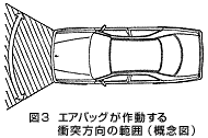 エアバッグは上述のように車両前面方向からの衝突形態のみに対して効果を発揮する。したがって、センサのセッティング(センサ位置や感度など)もそれに沿ったものとなっている。エアバッグの作動範囲の概念図を図-3に示す。また、作動する衝突速度も、事故分析の結果から実際に傷害の程度が大きくなる対壁換算速度(固定した壁に対して正面から衝突するときの速度)約20Km以上としているのが一般的である。