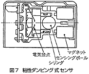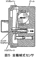 全機械式センサは文字どおり、電子回路など電気的なものは使わずに、衝突による衝撃を機械センサが感知して、ばね力などにより点火ピンを動かし、点火剤に着火させるものである。前述のセンサが、ハンドル内に搭載されるエアバッグのインフレータ内で使われている。図-5に一例を示す。これはSTC社製のセンサで、衝突による衝撃によりセンサ内のボールが移動し、押さえているトリガプレートがはずれ、ばね力によりファイアリングピンが移動、点火剤(信管)を衝撃力で着火する仕組みとなっている。