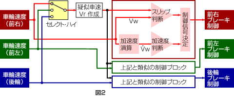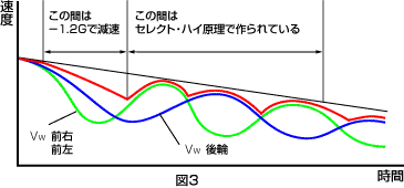 ABSは、前述したように車輪のスリップ率を理想スリップ率 Si 付近に制御するものであり、スリップ率を測るために車両速度 V は計測不能であるので、基本的入力信号として車輪速信号 Vw を用います。したがって基本的に四つの車輪速のうち、なるべく速いものを選択し(セレクト・ハイの原理と称する:すなわち制動時は最速のVwが車両速度に近いという原理)、これを基に疑似車速信号Vrを作成します(図2〜図3)。