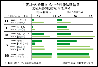 前面衝突試験だけでなく、ブレーキ性能テストでも、 各クラスで日産車はトップレベルの実力を発揮しました。 エアバッグによってクルマの安全性を世の中にアピールした日産は、 ブレーキでも安全性能をリードする実力を誇っています。