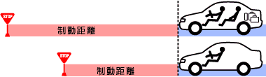 同じクルマであれば制動距離は車両総重量に正比例し、スピードの2乗に比例して長くなるといわれています。またスピードを出せば出すほど制動能力は落ち、荷物を積めば積むほどクルマのバランスが悪くなり制動距離は長くなります。つまり乗用車でも1名乗員の時と、乗車定員いっぱいに乗った時では、制動距離も変わります。乗員が多い時、荷物が多い時はこのことを頭に入れ注意して運転してください。