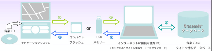 あらかじめパソコンにダウンロードしておいた"タイトル情報サーチ"で、インターネット上のGracenote®データベースにアクセスし、アルバムのタイトル情報を取得する。 |