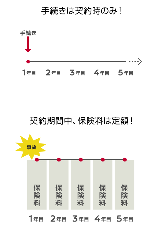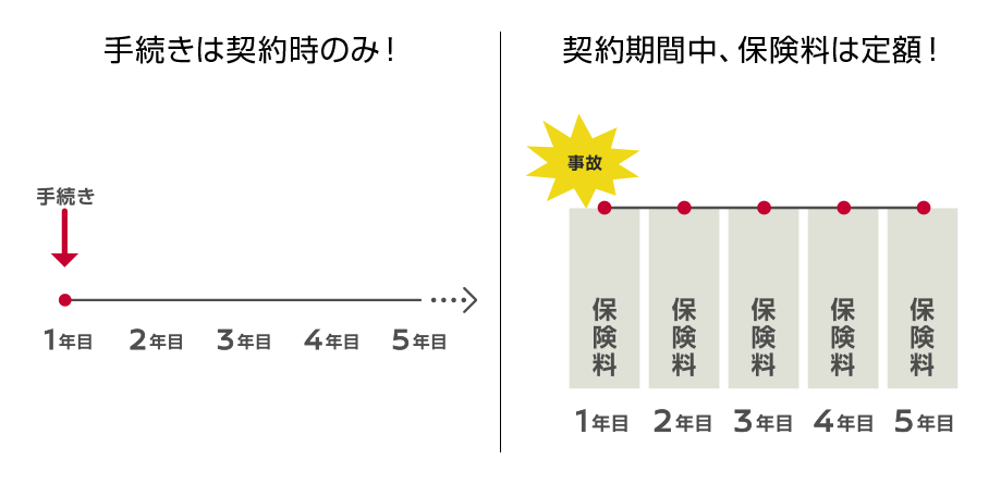 保険の手続きは契約時のみで、手間のかかる毎年の更新手続きは不要です。