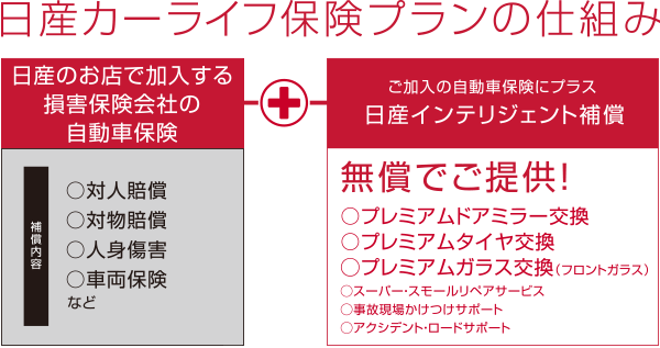 日産カーライフ保険プランは、対人補償・対物補償・人身傷害・車両保険など、通常の自動車保険の補償に加え、「日産インテリジェント補償」という6つの無償特典を受けることができます。