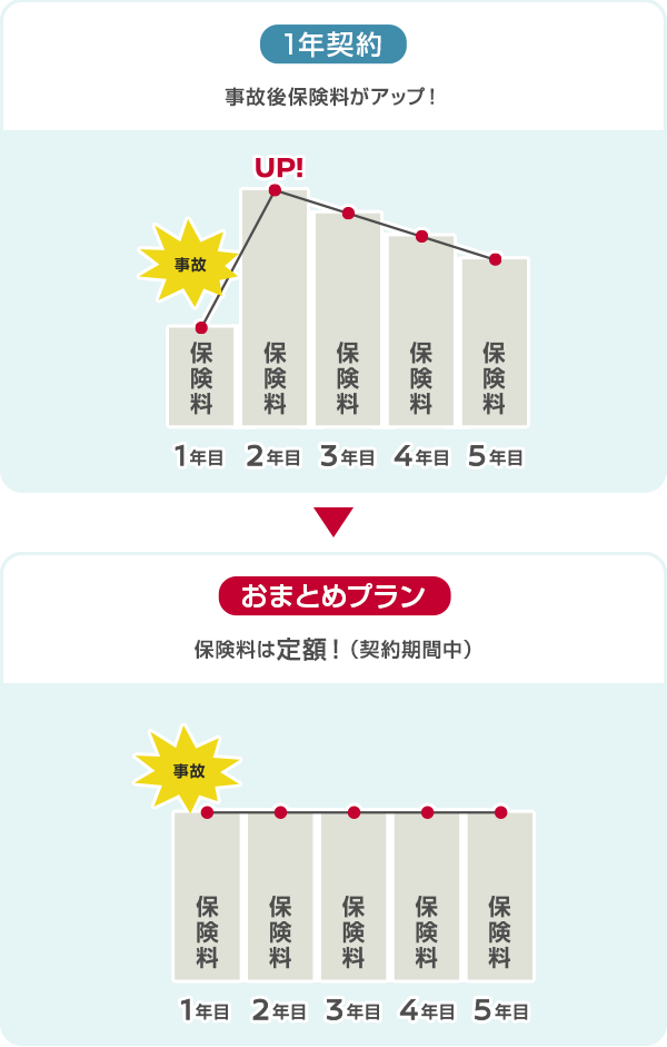 通常、事故の際に保険を使って修理をすると、翌年の保険料が上がってしまいますが、「おまとめプラン」に自動車保険を組み込めば、リース契約期間中の保険料が上がることはありません。「おまとめプラン」なら、契約期間中の保険料も定額となります。