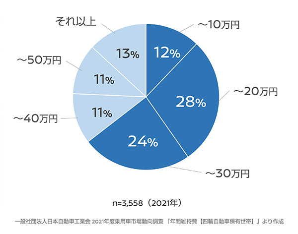 一般社団法人日本自動車工業会が公表している「2021年度乗用車市場動向調査」によると、クルマの年間維持費は、次のようになっています。
