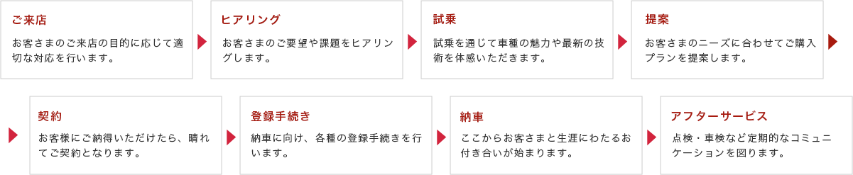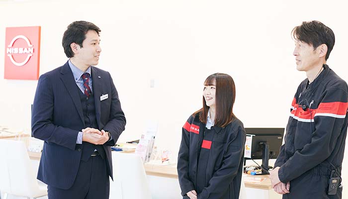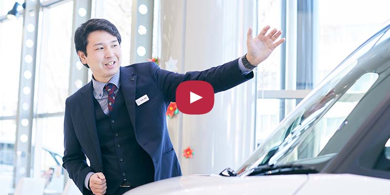 - お客さまが、点検・車検のために来店。お待ちいただいている間に、お困りになっている点やご要望をお伺いし、燃費や走行距離などを踏まえて課題解決(メンテナンスサービスの活用や燃費のよい新車の提案等)のご提案をします。