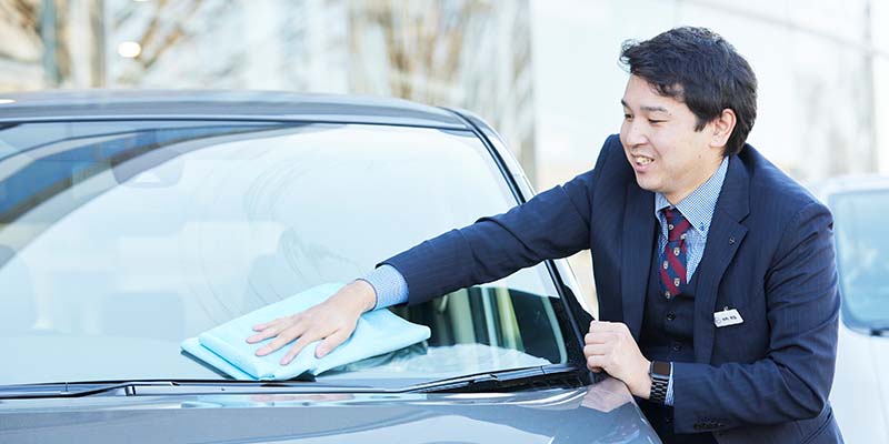 - 気持ちよくお客さまをお迎えするために、展示車や試乗車の洗浄、店舗の清掃などを行います。