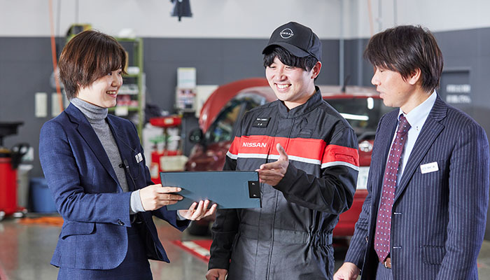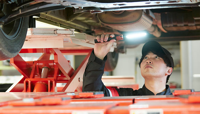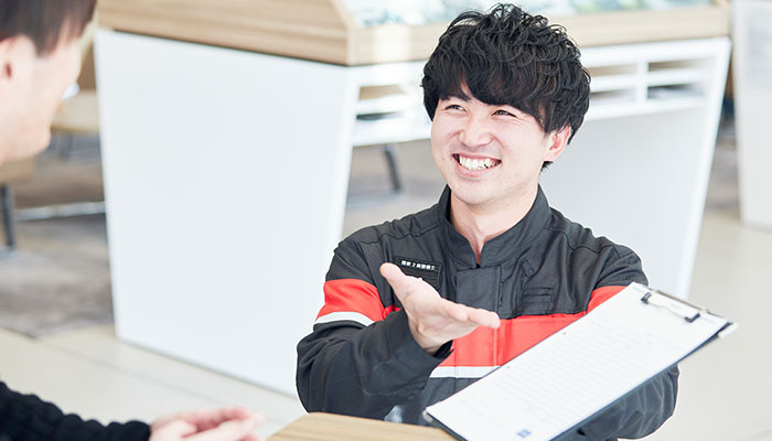 - 点検結果をまとめ、部品交換が必要な場合は見積書を作成し、お客さまへご説明します。場合によっては工場にてお客さまに下見せを行い、納得してご判断いただけるよう配慮します。