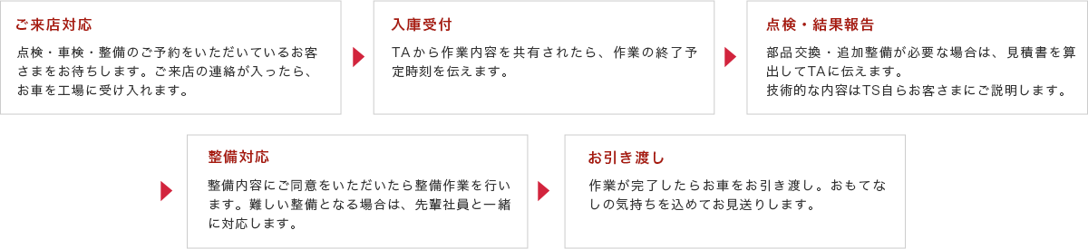 - TAからコントローラーに点検・車検・整備内容に関する情報が引き渡され、TSに作業が振り分けられます。また、TS自らお客さま対応をすることもあります。