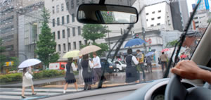 雨が降っているときは日中でも暗いときもあり、さらにウィンドウに付着する水滴で視界がかなり悪くなっています。特に後方と斜め後ろに関しては、晴れの日に比べ格段に見通しが悪くなるので、いつも以上に注意が必要です。
