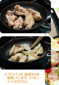 フライパンに鶏肉を焼いた時の脂が残っている場合は、拭きとってから使います。