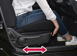 シート前方の下部にあるレバーを引きながら、シートを前後させて位置調整※。