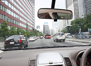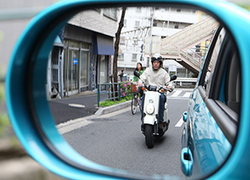 左へ車線を変える場合は、とくに路肩をすり抜けてくるバイクなどに注意。ドアミラーや直視でしっかりと確認を。