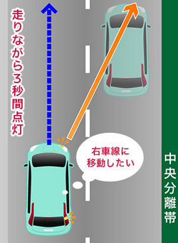 ギリギリのタイミングでのウインカー点灯は危険。まわりのクルマが「車線変更」を認識できるよう余裕をもった意思表示を。