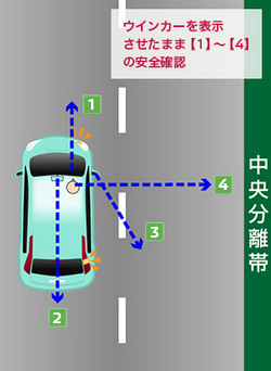 実際に車線を変える前には、ウインカーで意思表示している間にもう一度安全確認を。まずいま走っている車線の前方を直視で、後方はルームミラーでそれぞれ確認。車線を変えたい方向(図の場合は右)をドアミラーで確認した後、最後に直視でドアミラーの死角となる真横を確認。