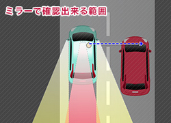 右図はミラーで確認できる範囲。死角となる部分は直視で確認しよう。