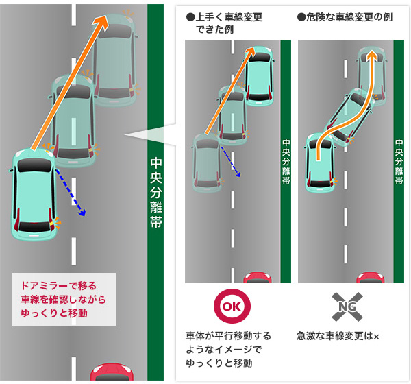 安全が確認できたら、いよいよ車線を変えます。急にハンドルを切るのではなく、車体が真横に平行移動するイメージで、ゆっくりと移動開始。この時前方を見つつ、ドアミラーで移動する車線を確認しながら移動するのがポイント。