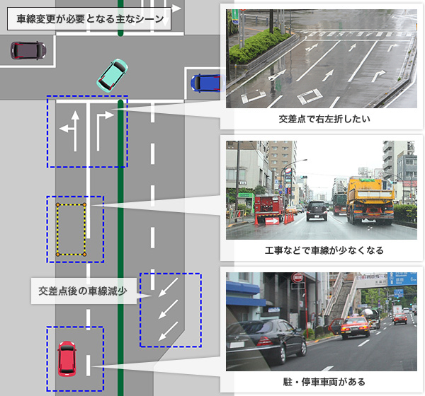 余裕をもって安全に車線を変えるためには、道路の変化を見逃さないことが重要。上手く車線が変えられず一旦停止してしまうと、走行しているクルマとの速度差がつき、ますます移動が困難に。車線変更が必要なサインを見極めつつ走行するのがポイントです。