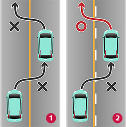 ① 左右どちらの車線を走る車も、車線変更が禁止されています。