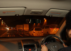 トンネル内での車線変更は、ライトが点いていないクルマがいることも想定して安全確認は充分に。