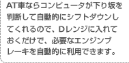 長い坂を下るとき、ブレーキを踏み続けているとブレーキが過熱して、効きが悪くなったり、最悪、効かなくなってしまうことも。アクセルを戻してエンジンの回転抵抗を利用した「エンジンブレーキ」を使って走りながら、スピードが増してきたときだけブレーキを踏むと、ブレーキも冷却できて安心して下ることができます。