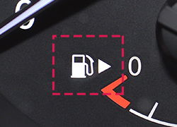 メータの給油機マークを見てください。車種によっては、給油機マーク横の「▲」マークが、給油口の位置を示しています。写真の場合は、クルマの右側に給油口があります。