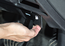 - 車の運転席下のレバーを引いて、給油口を開けます。