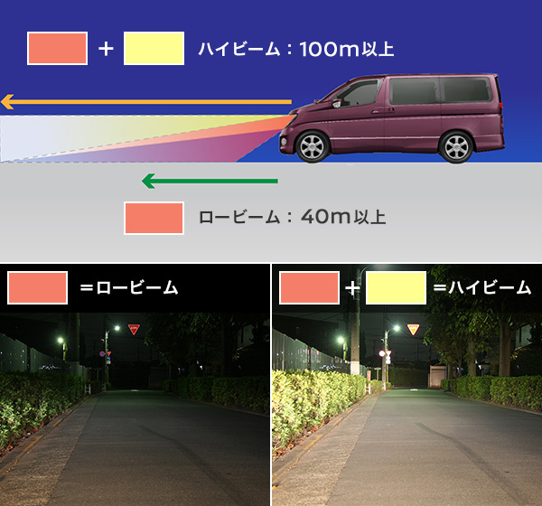 ヘッドライトには、100m以上照らすことができる「ハイビーム」と、40m以上の「ロービーム」の2種類があります。