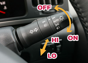 点灯はスイッチの回転、LOとHIの切り替えはスイッチを前後動で行ないます。ラゲッジに荷物を大量に積んだ場合など、ライトが上を向いてしまうこともありますが、一部の車種では自動もしくは手動でライトの傾きを調整することができます。