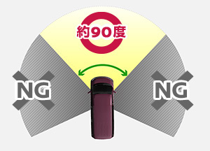 昼間は目に見える物をそのまま認識できますが、夜は街灯などで照らされている部分以外はライトで照らさないと視界を確保できません。このため視界は基本的に前方のみとなります。またその視界も約90°と、昼間にくらべるとかなり狭くなります。