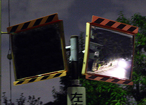路地などのミラーに映るライトはほかのクルマの接近を知らせるサインです。光りの大きさにより、対象車とどの程度離れているのかを知ることができます。