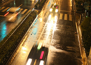 雨天の場合、路面に対向車のライトが反射するので、路面を直視しないで視線を外しましょう。路地ではこの路面反射で、ほかのクルマの存在を早めに知ることができます。
