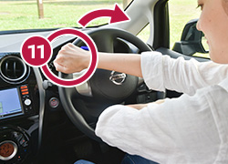 右手を、11時の位置に持ち替え引くようにしてさらにハンドルを切ります。左手は離してしまってかまいません。