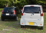 隣に止まっているクルマのドアミラーがほぼ同じところに来たらストップ。シフトレバーを“P”に入れて、サイドブレーキをかけたら完了です。