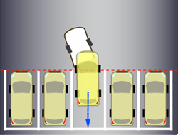 ドアミラーで駐車スペース入り口の左角と左後輪の距離を確認しながらさらにバックします。左の後輪が駐車スペースに入ったところで、ハンドルを右に戻しながらゆっくりとバックしていきます。