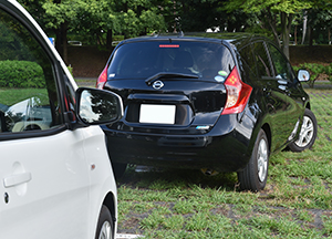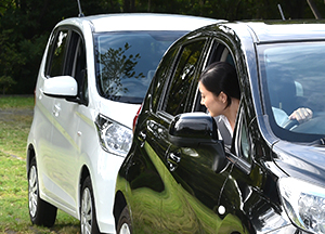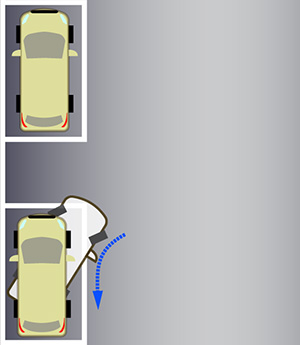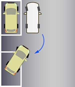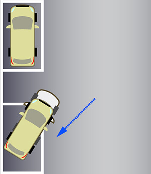 - 前方のクルマと平行に停車し、左にハンドルを切る