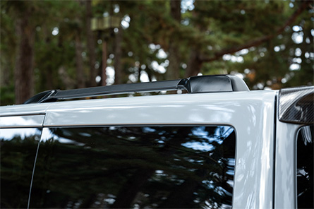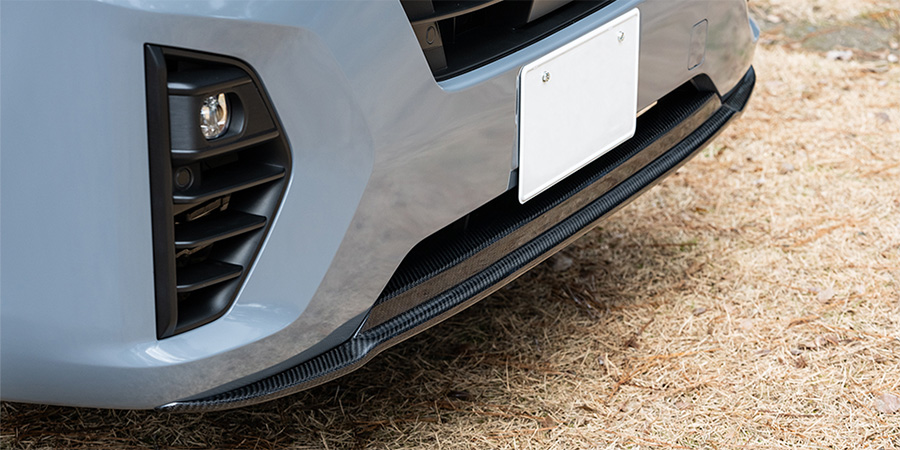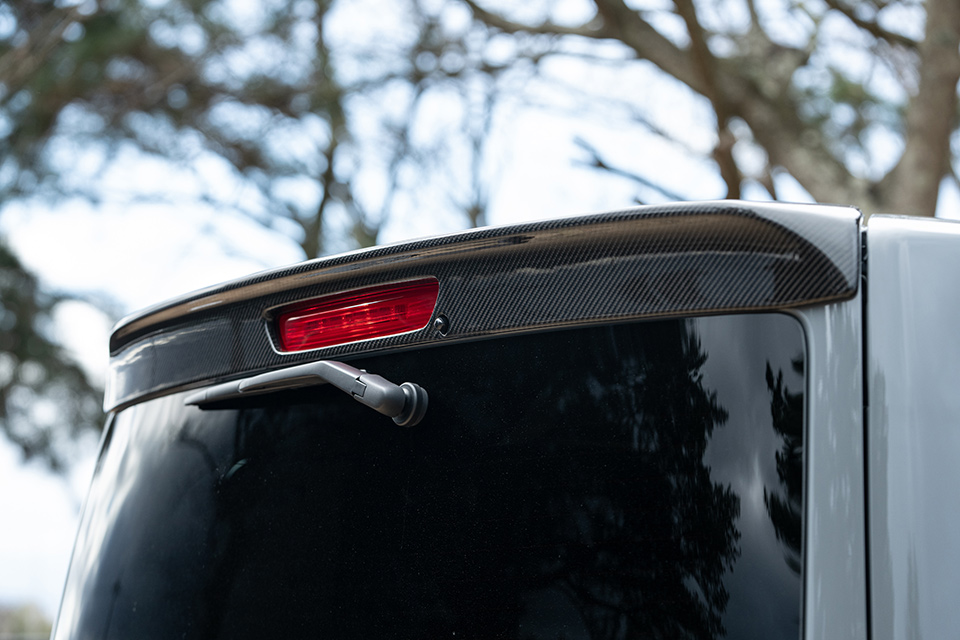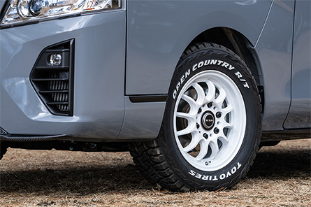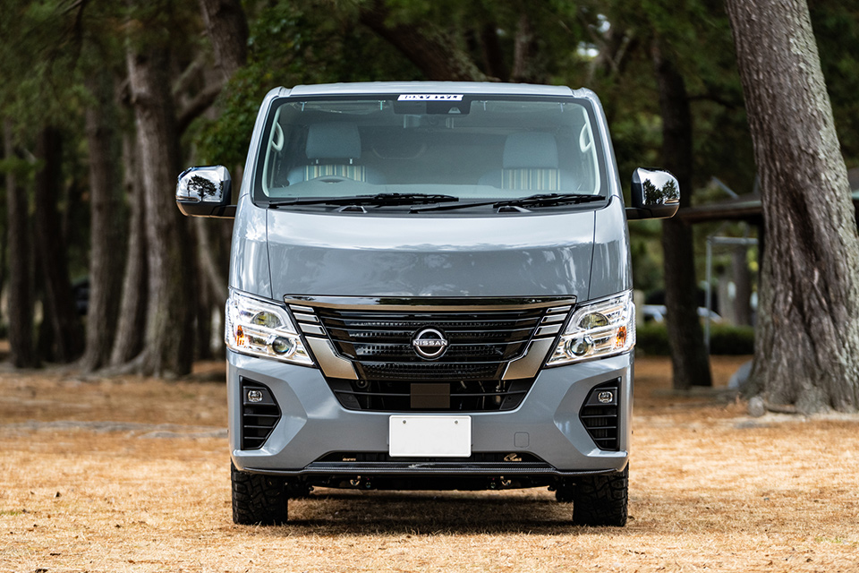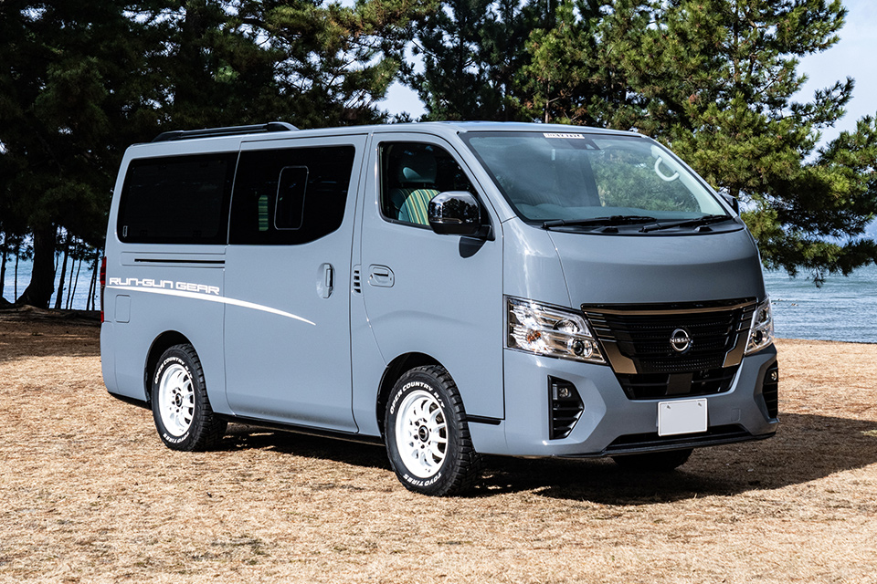 カーボン製スポイラー「カーボンテック」をフロント、サイド、ルーフスポイラーに装備。足元にはBOXY製のS12ユーロホワイト+TOYOオープンカントリー。プロトタイプとしてだがルーフレールも開発し、New日産キャラバンの外装をアクティブなSUVチックにグレードアップ。