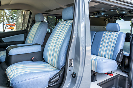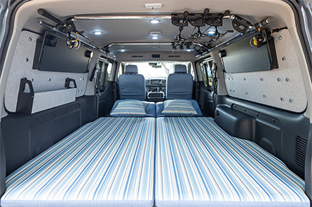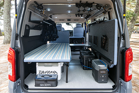 BOXY STYLEデザインのESフリップベッド(跳ね上げ式)、前後シートカバーをレトロ調ストライプ生地で揃え、ウインドウパネル、フリップテーブル、そして必須のロッドホルダーを装備。移動テーブルも備え、ランガン仕様に適したレイアウトとした。